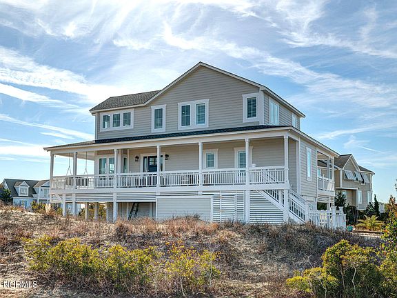 Perched high atop the dunes, enjoy breathtaking ocean views and cooling breezes at every turn from this stunning fully remodeled 4 Bedroom/3.5 bath home in the secluded gated community of Dunescape at Holden Beach! Step onto beautiful hardwood floors in the soaring two-story Great Room awash in bright natural light from floor-to-ceiling windows and you are immediately captured by the great vistas in every direction. The modern open kitchen with extra counter space and a desk area, a large granite-topped breakfast bar, and an oversized dining area are perfect for entertaining friends and family. The huge wrap-around covered porches are the ideal spots to kick back and soak in dramatic sunsets, grab a nap, or escape to the private fenced pool and large patio and grill areas below. The spacious primary bedroom features a luxury spa bath with a walk-in artisan ceramic shower, marble countertops, a separate seated vanity area and custom walk-in closet, and even your personal private shady porch retreat. A stylish powder room, separate laundry, and a convenient custom Drop Zone complete the main floor. Upstairs you will find a dramatic open