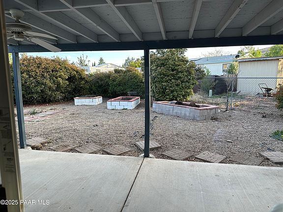 Tons of potential in this bright and open concept three bed two bath manufactured home on corner lot with view of Glassford Hill in the heart of Prescott Valley. Circular driveway, ample parking and attached garage. Neutral tile and laminate everywhere except one bedroom. Plenty of kitchen cupboards, kitchen island and built-in office area. Primary suite has soaking tub with grab bar and walk-in closet. Split plan with two additional bedrooms and full bath. Fenced backyard with covered patio, firepit, shade trees and landscaping. Walk to Prescott Valley Entertainment District's shops, restaurants, theater and special events, public and charter schools.