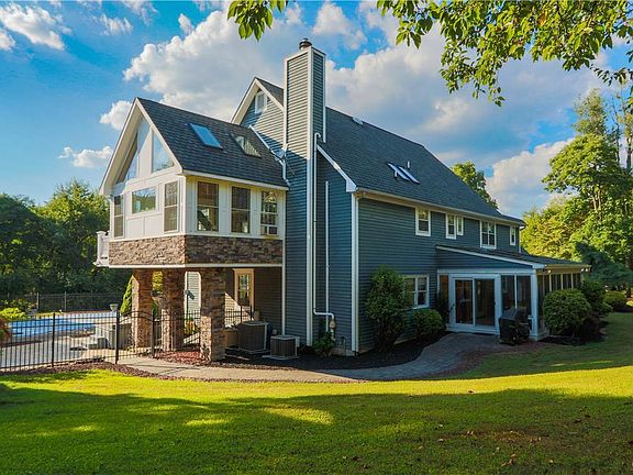 Country Home Estate situated on 2.4 wooded acres in a friendly neighborhood, yet offering privacy & tranquil setting. The meticulously maintained outdoors is an oasis encompassing a Heated pool, Hot tub, Covered patio, Pool house, Custom fireplace w/ built-in Grill & gorgeous Nature Views. Foyer opens to a bright Living Rm & an impressive Dining Rm w/ Wet bar, Cabinets & Granite. Sophisticated, high-end Kitchen offers large granite Center Island & Backsplash, VIKING, MONOGRAM & DACOR SS appliances & lots of storage, opens to Family Rm w/gas fireplace & built-in shelving, beautiful 4-season Florida Rm & 2 persons Office wing. 2nd flr offers Junior Bedrm suite w/ full bath, 2 additional Bedrms, 3rd Full bath & an impressive Master Suite w/ large Seating area w/ cathedral ceiling that could function as Exercise rm,  Spa-like Full bath w/ Bubble Tub & Dressing rm. Finished basement is a great space for entertainment & family gatherings. Adjacent 10 Acres also for sale for additional price.