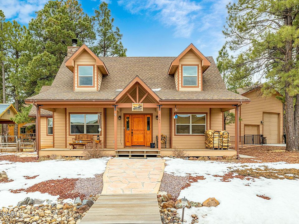 Immaculately kept 3 bed, 3 bath home. Cape Cod style open floor plan with vaulted ceilings, knotty alder doors, and engineered hardwood floors throughout the main level. You will enjoy a stone fireplace in the living room, or dining in your eat in kitchen. Stainless steel appliances, ample counter space and cabinetry will make entertaining easy. Your new owner's suite is located on the main floor of the home; with jetted tub and dual vanities in the ensuite. Upstairs you will find two guest bedrooms and bathroom. Outside you will relax in a backyard with split rail fencing and flagstone patio, with views of the golf course and the mature ponderosa pine forest. Property includes a detached 3 car garage with RV parking, garden shed, and workshop space located above the garage.