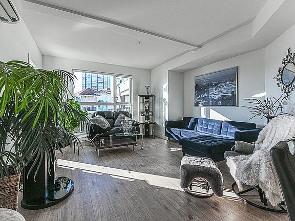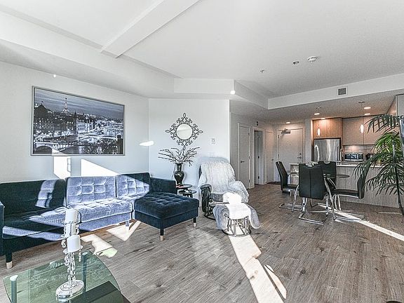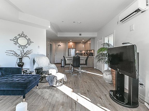 This well-designed home features 9 ft ceilings, an open-concept living and dining area, and a 75 sq ft balcony. The modern kitchen offers KitchenAid appliances, contemporary cabinetry, sleek trim, and modern lighting. Additional features include air conditioning in the living room, in-suite laundry, and quality finishes throughout.