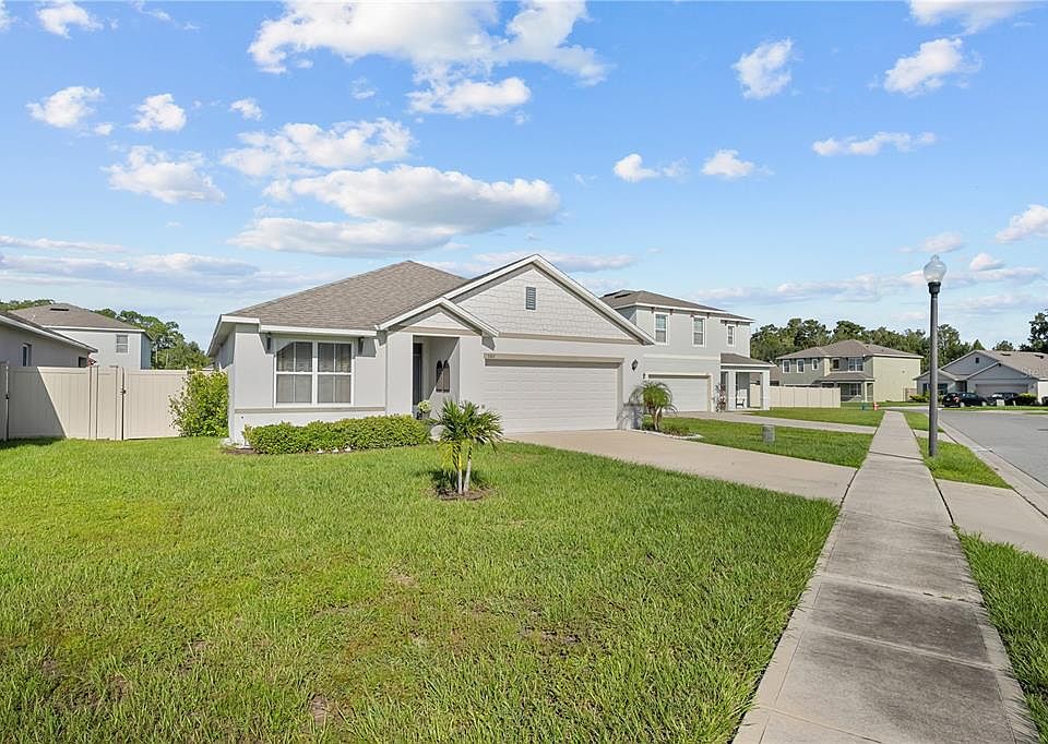 This newly built single family home has a strong combination of elegance and practicality that can support any families needs. This home contains 3 spacious bedrooms, 2 full baths. This charming home has brick pavers in the main entrance of the home and on the covered lanai. The family room has a beautiful accent wall and lighting fixtures throughout the house. This is a very nice lot with a great spacious back yard. It’s fully fenced. Moving inside, you’ll find bedrooms at the front of the home, along with a laundry room for added convenience. The entry hallway opens to a large great room, kitchen and dining space, and this area features volume ceilings and tons of natural light. The master suite is located at the back of the home for a quiet retreat and offers a luxurious master bath with an enlarged walk-in shower featuring tile surround, an extended dual-sink vanity, a linen closet, and walk-in closet. Outside, a large covered patio is perfect for entertaining. Only a few miles away from a Publix supermarket, shopping centers, and some of the best theme parks in Florida!
