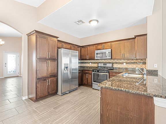 Beautiful 4 bed 2 bath home. The formal living area greets you at the front door. You will love the openness of the dining, kitchen and family room. Lots of cabinet space, pantry, island w/sink and stainless steel appliances is what this kitchen offers. Spacious family room holds a large sectional and shrunk with ease! You will not feel cramped with the comfortable dining area. Secondary bedrooms are quite large for the square footage of home. Hall bath has tub/shower with granite countered sink cabinet. Primary suite holds king size furniture with ease, walk in closet will not disappoint. Enjoy the garden jetted tub, separate glassed shower and double sinks in the primary bath. Backyard comes with wood tiled concreted areas, covered patio, sprinkler system for the grass and more. Home has beautiful shutters, epoxy flooring in garage to boot and cross from a park!! Oh did I mention Solar Panels to offset the cost of your electricity OWNER IS A LICENSED REALTOR IN THE STATE OF TEXAS 12 month lease required. Tenant pays all utilities. This is a non smoking home. No pets Tenant is responsible for landscaping maintenance.
