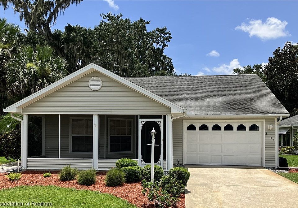 Cute, spacious, furnished home in the friendly, 55+ community of Highlands Ridge. Cathedral ceiling throughout, bright, open living room with sliding doors to the very nice porch. Large eat-in kitchen with loads of cabinets and prep space, big pantry, breakfast nook and pass-thru window to living room. Master bedroom has sliding doors to porch, two walk-in closets and big ensuite with double sink vanity, tile walk-in shower and linen closet. Enjoy greeting your neighbors from the screened front porch or the nice Florida room with large pocket sliding windows, ideal for the nice cool weather. Spacious garage with laundry tub plus washer, dryer and golf cart included (per seller, golf cart as-is, needs new battery). Go for a bike ride or take a short walk to the tennis courts. You'll love the community, surrounded by beautiful oak trees where you can take a refreshing dip in the two pools or spa, work out in the gym, go for a round of golf, play on the tennis or shuffleboard courts, and have a bite to eat at either of the two restaurants. The common facility fee covers lawn maintenance, use of amenities and subdivision maintenance. In addition, there's a $25/year HOA fee that covers being a member of the association and resident voting. Rentals allowed, with association approval, and two pets allowed.