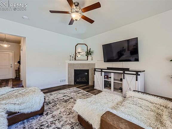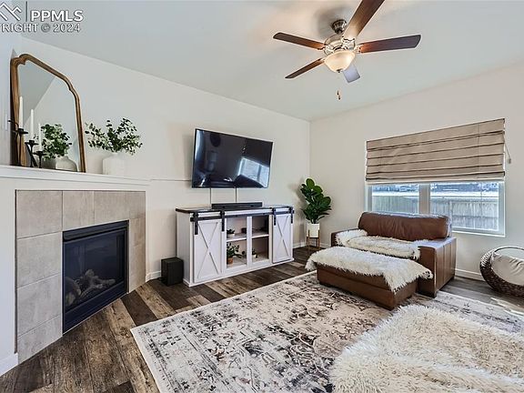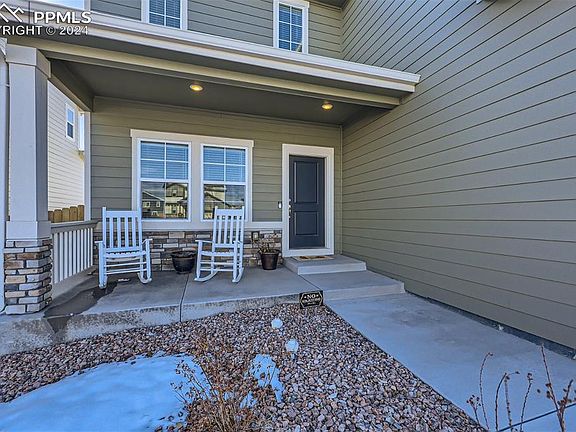 **Assumable Loan Available** Gorgeous 4 bed, 2.5 bath family retreat with modern touches and views of Pikes Peak! Built in 2021, this like-new home has no rear neighbors, upgraded amenities, an open main-level floor plan, private main-level office, large upper loft and a spacious upper primary suite. Upon entry, guests are greeted with dark luxury vinyl floors and 9FT ceilings with beautifully textured walls. An immediate left through French doors is your private office with built-in bookshelves fit for deep focus work or a cozy library. The foyer opens further into a gorgeous open-concept space with large family room, gas fireplace, dining area with overhead chandelier, and spacious kitchen featuring an oversized island, quartz countertops, white cabinetry, farmhouse sink and stainless steel appliances. Head upstairs from the foyer, and enter into a peaceful loft refuge perfect for relaxing before bed. Lush carpet and high ceilings lead you to three bedrooms with walk-in closets, a full bath, and laundry facility before entering into a spacious primary suite. Your primary suite with east-facing windows connects to a luxurious primary bathroom equipped with walk-in shower, large soaking tub, double vanity, water closet and expansive walk-in closet. *An easily accessed crawl space provides storage that spans the entire width and length of the home **Includes refrigerator, top-of-the-line smart washer and dryer, lean-to shed matching the home's exterior, tinted windows for comfort and energy efficiency, and a radon system. ***An inspection has already been completed for buyer convenience. ****Comes with a binder with all appliance, maintenance, builder and warranty documentation