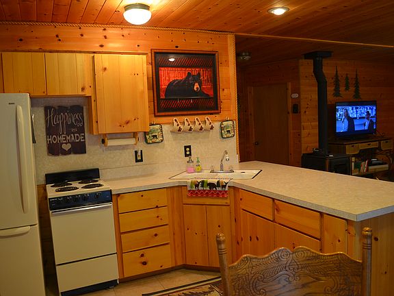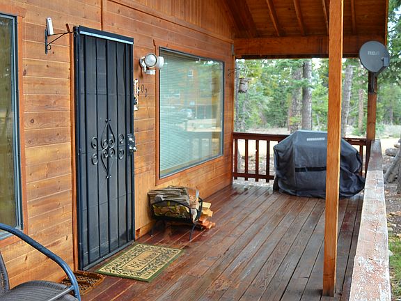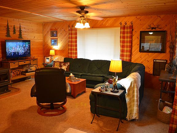 A delightful two bedroom cedar log mountain cabin. Comfortable & cozy, two words to describe this 2 bed, 1 bath cabin retreat. Inside the cabin is sprawled in an open floor plan style with a large living area w/ wood-burning stove, a kitchen, and a dining area. 3185 N Aspen is in a prime location! Situated on the corner of Aspen and Bonanza, this property has a wrap-around driveway nicely laid with gravel. Additional features include a detached single stall garage and a manicured outdoor fire pit. Enjoy the front covered deck surrounded by pine trees. Includes refrigerator, stove oven and microwave. Shed for ATVs. This home is ready for occupancy.