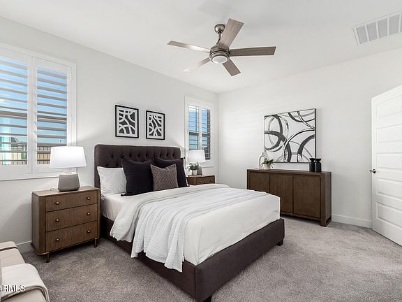 This light and bright 3-bedroom + den (with closet), 2-bathroom home offers 1,761 sq ft of thoughtfully designed living space and a highly desirable split floor plan. Located in the sought-after community of Mystic at Lake Pleasant, this home features wood-look tile throughout, plush carpet in the bedrooms, wood shutters, and soaring 9 ft ceilings.