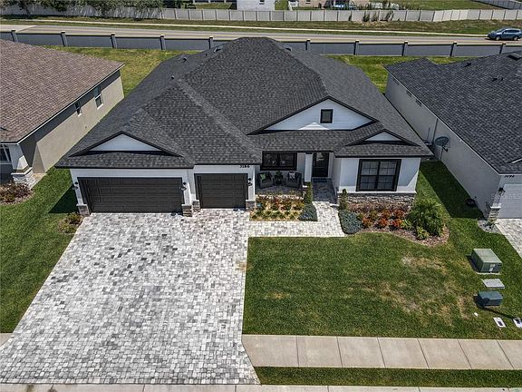 Amazing home in amazing condition! Like new Tapia Construction home in the beautiful South Lakeland gated community of Highlands Grace. Built in 2020, this home shows like new and is filled with many builder upgrades! 4 beds, 3 baths, office/den, oversized 3 stall garage with over 2,300 sq. ft. of living space with no steps. Upon entering you are welcomed with high ceilings and beautiful wood looking tile flooring, giving you that luxury living feeling! Tile continues throughout (no carpet), coffered ceilings with crown moldings, granite counter tops (including kitchen and baths), upgraded light fixtures and Samsung appliances, LED lighting, insulated windows and lots of them, security system, large kitchen pantry, solid wood cabinets, ceiling fans in every room and so much MORE! Relax and enjoy the oversized screened in Lanai with expanded brick paved patio and triple sliding patio doors that opens the room up into one large space, letting the outside in on those cool winter evenings! Pamper yourself in the large master suite with a spa like bath that includes a pebble stone floor walk-in shower, large tub with tile surround, dual vanity and walk-in closet for more storage space. Plenty of room for off street parking in the brick paved driveway leading into the 3 car garage that has an extended 3rd stall and attic ladder for extra storage. As expected with any Tapia built home, you can feel the quality the moment you walk in the front door, this home will be sure to sell quick! Call and schedule your showing today!