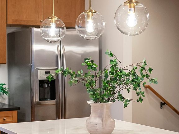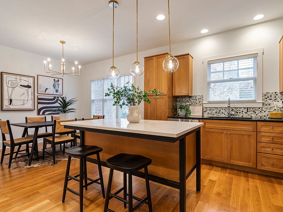 This move-in ready home features custom finishes throughout, including sleek stained concrete floors on the main level, warm pine wood ceilings, and modern designer lighting. The open-concept kitchen showcases a striking tile backsplash, abundant solid maple cabinetry, and clean, sophisticated lines ideal for today’s modern lifestyle.