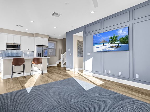 The spacious living area with designer touches flows seamlessly into the dining room and a modern chef's kitchen complete with a large island topped with quartz countertops, brand-new stainless-steel appliances, and a roomy pantry. Enjoy easy indoor-outdoor living with a generous balcony right off the dining area perfect for morning coffee or evening relaxation complete with a view of the mountains and the beautiful neighborhood of Rienda.
