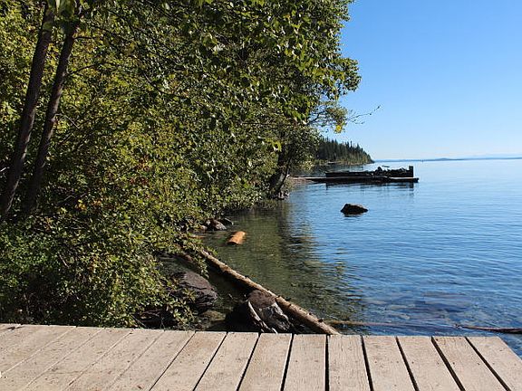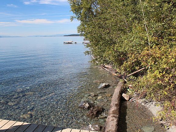 Beautiful, mostly untouched waterfront acreage along 332 feet shoreline of Flathead Lake. 4.29 acres has upper bench with existing 3 bedroom home with views, big deck, separate garage..could be used as guest home while you make plans to build down by the lake.