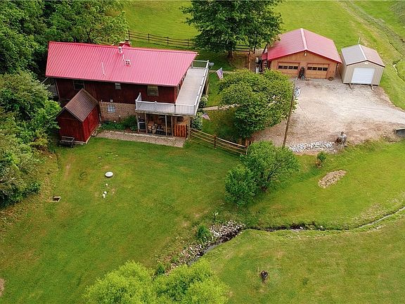 Beautiful modern chalet style home situated on 14+ acres. The cathedral ceilings, sliding doors, and trapezoid windows welcome an abundance of natural light to the main level's great room. This space leads out onto a roomy deck made of low maintenance composite. The kitchen is open to the great room and is freshly updated including new reverse osmosis water filtration system and new appliances. The main level includes the primary suite with updated bathroom, second bedroom, and half bath, with both bedrooms leading to a private back deck. Downstairs, the large versatile family room features a Harman Mark III wood/coal burning stove for optional added coziness. A large utility/laundry/half bath, a full bath, and two more bedrooms are also located on the lower level, as well as possible fifth bedroom. The family room french doors lead out onto a patio, with your own private hot tub which conveys. A new split rail fence with wire mesh keeps little ones and pets safely in the yard. The ove