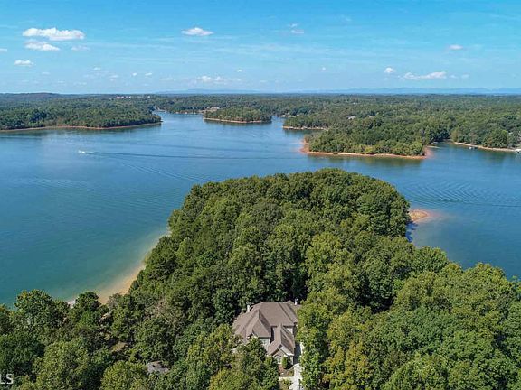 Waterfront custom home on prime protected point lot. Lake Lanier luxury, with captivating year-round sunsets/sunrises. Discover for yourself the level easy 50-foot walk to a 32' x 32' custom dock. This deep water dock contains the following: 2 boat lifts, Electricity, Running water. The connection between the Piano room, Dining room, and outdoor patio is made through floor to ceiling windows. The pleasant moments during dinner are completed by a wonderful lake view. The main level has many features: Two-story library with a ladder, Piano room with coffered ceilings and fireplace, Dining room, Chef's kitchen, Butler's pantry, Keeping room with fireplace, Guest bedroom with a full bathroom, Owner's suite with custom closets, en-suite and balcony. The second Level offers the following: Built-in bookcases, Second den with fireplace, Two bedrooms with two and a half bathrooms, Study with a refrigerator, fireplace and balcony. The terrace level offers the following: Home generator for endless power, Office, Den number three with fireplace, Huge bedroom, Full Bathroom, Fitness center, Arcade.This home is professionally landscaped along with a custom outdoor stone fireplace for you to enjoy after a great day boating on Lake Lanier! There's plenty of room for your custom pool. Located near the finest and most comprehensive medical services in Northeast Georgia. Whether you're a fan of the big city or mountains, Lake Ranch Estates offers a great location for many lifestyles.