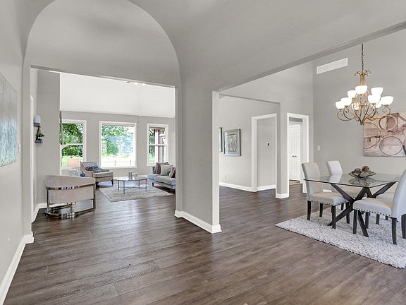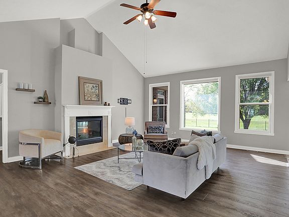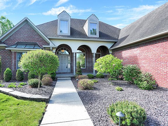 Stunning ALL Brick Carmel Ranch, ideally located in highly sought after Foster Estates! Welcomed w/Lavish low-maintenance landscaping + copper awning + accent spotlights to illuminate home at night, & covered porch. You & guests will be in awe as your enter. Towering 12'+ ceilings, elegant flooring, open concept tailored for luxury living, with a spacious great room that flows seamlessly into dining and kitchen. GR features bay windows for natural light, and cozy gas fireplace. Gourmet kitchen: SS apps, granite counters, breakfast bar + eat-in area, that walks out to your completely fenced backyard (3 gates) and large patio. Fully finished basement Addl: WFH Office, Tankless WH, New Insulation, Built-in Vac, HE Furn, Undermount Light & More