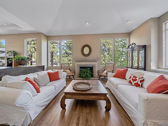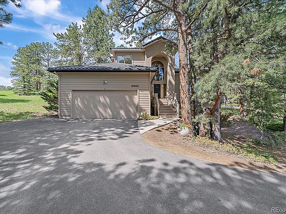 LOCATION! This stunning North Evergreen custom built home is located in the coveted Hiwan neighborhood on a cul-de-sac road. It's near all the conveniences that Evergreen has to offer: from grocery stores, schools, and restaurants. There is also easy access to I70. It features many upgrades, including exterior stained in 2020 and newly stained hard wood floors, and has been meticulously maintained. You will also have peace of mind with the stone-coated metal roof with a lifetime warranty. The top floor is a spacious primary bedroom suite with a 5-piece bath that includes a spa bath, walk-in closet, and a home office that can be converted to a non-conforming bedroom or nursery! The main floor features a grand open living/dining area with a fireplace, high ceilings, and large windows throughout. The eat-in kitchen boasts granite counter tops, a large center island and high end appliances, custom cabinetry, a fireplace, and a cozy sitting area. Fireplace mantles are custom fireplace hearths made of Ataquine (unpolished Mexican marble). From the kitchen, step outside to a large Trex deck that extends the full width of the house. The lower level has a walkout living room/office, two bedrooms and a full bath and beautiful wide windows. Walk to all that Bergen Park has to offer including the Elk Meadow Open Space and the Buchanan Rec Center. The best of foothills living.