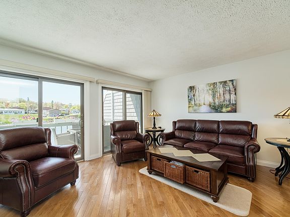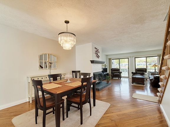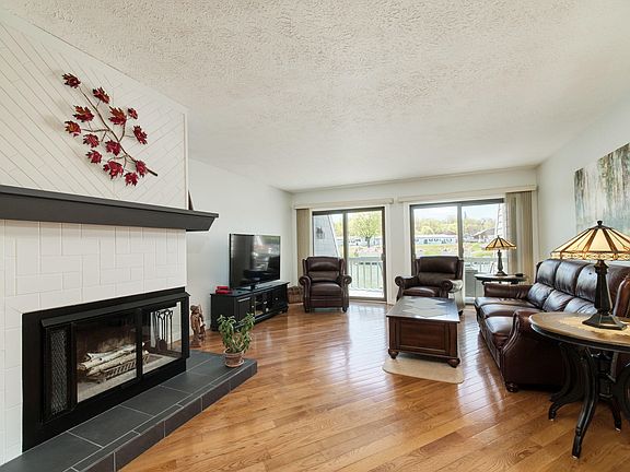 It's rare for a Lake Ridge Landings condo to hit the market! Includes 40 ft boat slip in front for direct access to Lake Michigan. 3 levels of living provide private areas inside while each level has a deck with shake covered walls for privacy outside. End unit so quieter & has extra large patio stone courtyard. Main floor has open floor plan, hardwood floors, fireplace, half bath & newer kitchen with Kraftmaid cabinets & granite countertops. Upstairs master has private bath and large 2nd bedroom has full hall bath. Walk-out level could be third bedroom or family room with full bath & finished office/den. Vinyl shake exterior, new deck installed on walk-out level and even a one car garage. Furnace new 2016. Rent minimum 6 months. Amazing view of the freighters & no wake boat travel!
