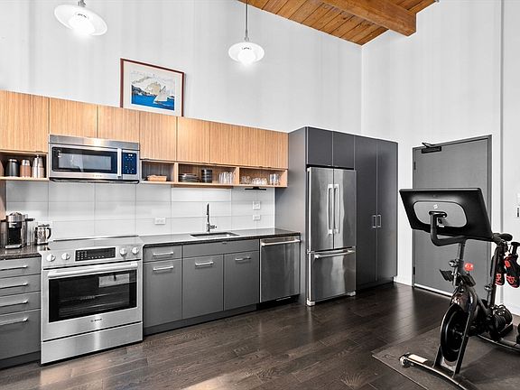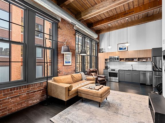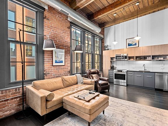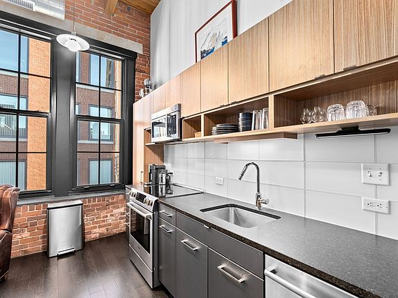 Urban Style Loft Living in Fort Point Channel. Authentic brick and beam architecture, efficient layout with flex floor plan. Wood flooring,13' beam wood ceilings, soaring sun filled insulated windows with electronic custom black out shades. Space allows for home office or dine area, sleek kitchen w/S.S. appliances, zebra wood finished cabinetry offering honed black granite countertops. Queen size Murphy bed -shelving -cabinets and lighting on light stand. Spa like spacious bathroom tile shower and glass door, shelf under sink. Spacious custom walk-in closet, central air, laundry in-unit, hall closet. Expansive common roof deck with breathtaking City scape views.Boutique entry with intercom, chairlift, elevated building, private lower level storage and secured bike area. Neighborhood central located to So Station-Amtrac,Financial and Seaport Districts, short walk to Boston harbor retail shops, bus lines and underground trains. Many trendy restaurants and shopping near by.