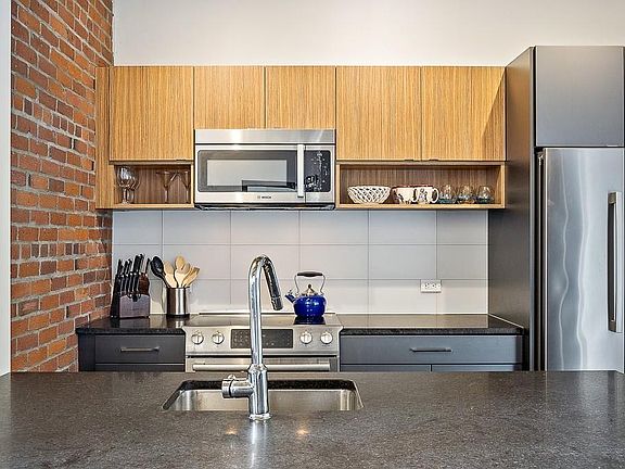 A 2016 conversion of a former leather goods warehouse, 319 on A offers 48 luxury loft-style residences, archetypal of the Fort Point Historical district. This exceptionally handsome penthouse home seamlessly blends luxury finishes with industrial elements, such as soaring ceilings, exposed brick, metal, and beam. One of the most desirable in the building, it's bathed in all-day sunlight from 7 oversized southern facing windows. The den easily functions as a guest space or nursery with a window and storage. Stunning custom woodwork, including solid walnut french doors and built-ins, set this unit apart with a warmth not often found within this style. Common areas include an industrial-chic lobby and fabulous roof-deck featuring grilling stations and city views as well as bike storage. A small storage unit is privately deeded. Several world-class restaurants, art galleries, fitness studios, and a Trader Joe's can be found in this vibrant neighborhood adjacent to the Seaport District.