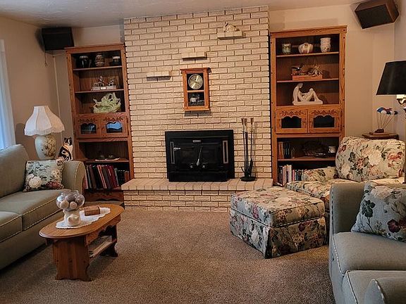 Cozy well maintained rancher. Great location a couple blocks from City Mkt and 2 blocks from hospital. A large vestibule greets you as you enter with lovely leaded glass front door adjacent to the spacious living room which features a beautiful blond brick fireplace with insert, well lit and high lighted by a huge front window. Next is the full dining room just a foot from the gorgeous custom kitchen sporting pull out shelving, deep drawers, plus pantry & highlighted by an attractive accent tile back splash, many custom features and even has a nice breakfast area with a window to watch the new fawns frolic in the back easement... Next is the super family room complete with wood burning fireplace. Plenty room for pool table or space for large gatherings. You will love the 28 foot covered porch overlooking a serene tree shaded and grassed yard all under sprinkler system. The insulated detached 2 car garage is a joy for hobbyists with plenty of storage. This home has been beautifully updated and you will certainly be surprised with the care that has been given. Includes Central Vac NOTE : only grass next to street is in the flood zone.