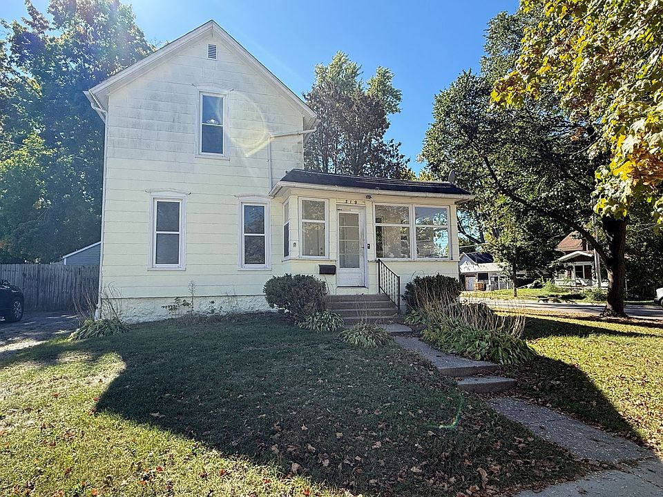 Two-story single-family home available for rent. The property offers a double driveway and a fenced backyard with a deck, along with an enclosed sun porch at the front of the home. Inside, you'll find a large living and dining room, a spacious kitchen, and a separate laundry room with washer and dryer on the main floor. The layout includes one bedroom on the main floor and one upstairs, along with a sitting area that provides additional living space. The home also features some new flooring and includes a basement with storage space. Tenants are responsible for lawn and snow, and all utilities.