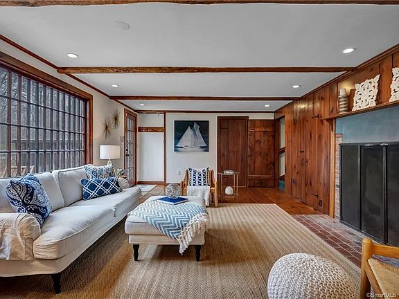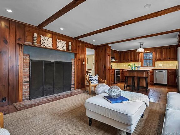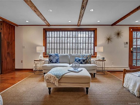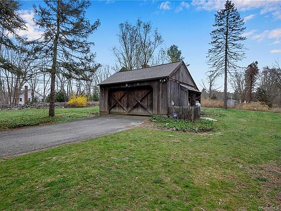 Set far back behind a quintessential New England stone wall, this handsome reproduction antique was built in 1964. The residence boasts wide plank wood floors throughout, a beautiful oversized wood-burning fireplace, and front and rear staircases plus modern conveniences including central air and a whole house generator. The house feels light and bright, with fresh paint throughout and abundant sunlight. The kitchen opens to the family room, creating a perfect place to entertain and relax. It features a granite island, stainless steel appliances and a double oven range. Natural light streams in to the family room through a huge picture window. The large dining room has recessed shelving for display. There's a full bath on the first floor, off the living and family rooms. If you need a first floor bedroom, consider converting the living room, which features a large walk-in closet. Upstairs you'll find three bedrooms along with a second full bath. One bedroom offers built-in twin beds, and the largest bedroom has two closets, one a walk-in. The basement has a great storage with built-in shelves, newer washer and dryer (2019, and a semi-finished room that can be used for exercise or play. The 2-car detached garage/workshop has high ceilings, built-in workbenches, an insulated new roof (2020, and a heater.The red cedar deck, approximately 20' x 12', overlooks a large level yard. Located close to town on the corner of Durham Road, with the entrance on Rolling Meadow Road.