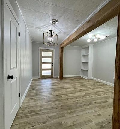 Welcome to your dream home in the heart of a peaceful rural town! This beautifully renovated 3 bedroom, 2 bathroom home is situated on 4 lots offering ample space for outdoor activities. Step inside and be greeted by a tastefully updated interior that seamlessly blends modern comforts with rustic charm. The open-concept living area is perfect for entertaining, featuring a spacious living room with a custom entertainment center and cased opening to a large dining room and kitchen. The modern kitchen boasts quartz countertops, tile backsplash, a large island, stainless appliances and a walk-in pantry. The master suite is complete with a large bedroom and a bathroom with a tile shower and dual sinks. Two additional bedrooms provide plenty of space for family or guests. Additionally, this home features an oversized laundry/utility room and an office with custom built shelving, brand new concrete driveway, new windows, fixtures, and luxury vinyl flooring throughout. Conveniently located near everything in town! Flood zone X.