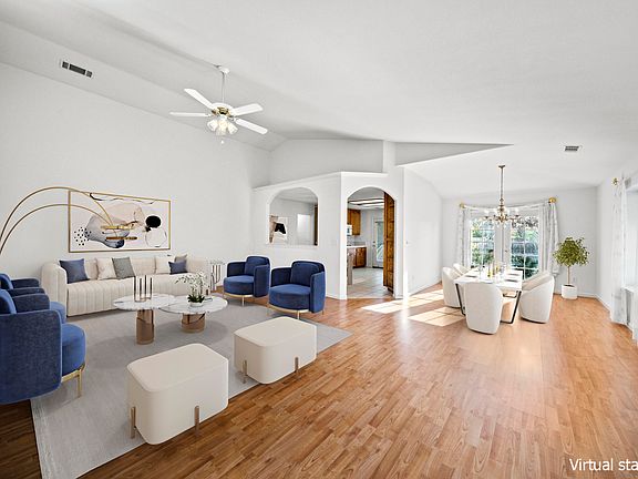 Located in the highly sought after ''The Vineyard'' subdivision! This charming home offers a spacious, bright, and open living area with vaulted ceilings and tons of natural light! An inviting kitchen boasts archtop accents, tile flooring, tile counter tops and plenty of cabinets for storage! The luxurious master suite includes a huge walk-in closet and a bathroom with tile flooring, counter tops, and shower! Relax on the covered back patio with it's low maintenance landscaping! Outdoors, there is a community swimming pool, clubhouse, bocce ball and shuffleboard courts. There are also two beautiful ponds, which are each surrounded by lighted walking trails.!