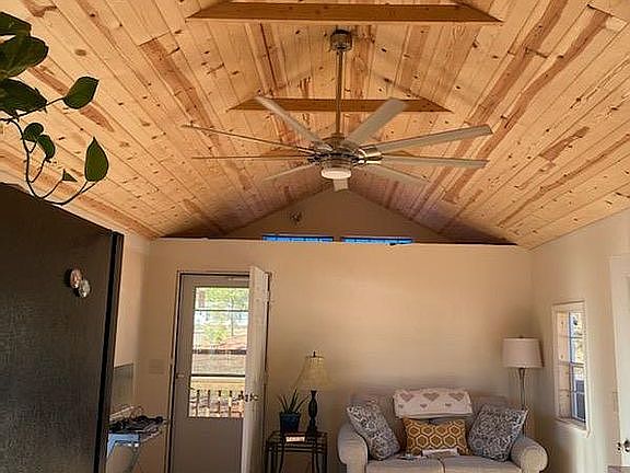 14 x 40 - 540 sq. ft. stick built home with a sleeping loft. One big bedroom ( queen bed ) walk-in closet & separate laundry space. Kitchen & Living room combined with vaulted, pine ceilings. Regular sized bathroom with a tiled walk in shower. Floor is ceramic tile & laminate through out. A very comfortable livable space.