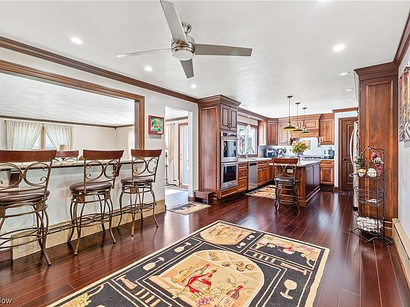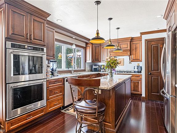Charming 3 bedroom 2 bath split level in the heart of CANFIELD! Step inside and be greeted by an exquisite amish built kitchen, complete with full size double ovens, a unique Kitchen Aid pull-up feature and top of the line stainless steel appliances. The spacious family room beckons for gatherings, while the cozy living room, accentuated by a fireplace, invites relaxation. Outdoor enthusiasts will adore the large deck and patio, both perfect for entertaining. Picture nights around the built-in fire pit, with the serenade of the nearby creek and breathtaking view of the woods as your backdrop. A bonus shed provides additional storage. This home isn't just a residence, it's an experience. Schedule your private showing today! Roof 5 years, HWT 4 years, Newer Appliances