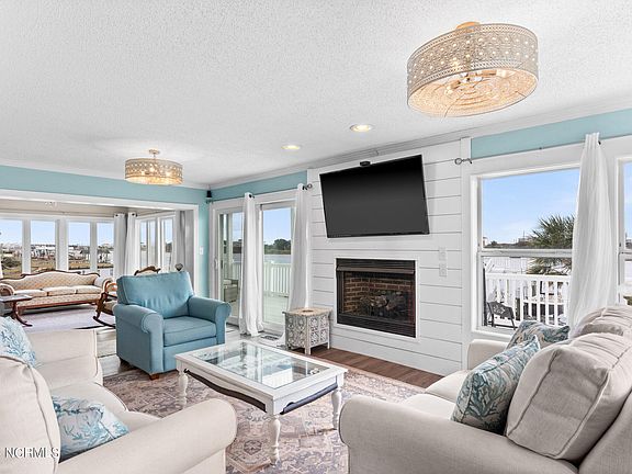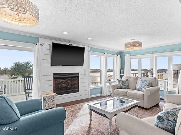 Indulge in waterfront living with this Intracoastal gem! This meticulously updated property offers an unparalleled living experience on the coast of NC. Featuring 2,400+ sq ft, the main structure, 1st & 2nd floors were built in 1979, while the 2nd floor den & office and 3rd floor master suite were added in 2016. This home is a boater's dream with private, deep water access to the ICW, a boat lift, and a private ramp (renovated in 2024). Enjoy fishing and sunbathing from the two-story dock. The open concept floor plan blends indoor and outdoor living, making entertaining a delightful experience. Step into a kitchen adorned with granite counters, stainless steel appliances, and a raised bar, overlooking the dining area and a spacious family room. The gas log fireplace, shiplap accent wall, and expansive windows create a warm and inviting atmosphere. A massive sliding glass door leads to a sprawling deck, offering panoramic views of the yard and waterway. The sunroom leads to a home office with ample storage, while the entire space is bathed in natural light, showcasing the Intracoastal Waterway. The master suite is a show-stopper - with both ICW and ocean views. The master bath features 2 vanities, a tile walk-in shower with a glass barn-style door, built-in towel cubbies, and a water closet. The ground floor welcomes you with the main entry, a staircase to the second floor, a versatile flex room perfect for guests or a private office, a laundry area, and a full bath leading to the ground-level outdoor entertaining space and yard. Recent enhancements include a new expanded driveway, dishwasher, freshly repainted exterior, and a new front door added in 2023. Additional highlights include a pull-through garage measuring over 38 feet deep, providing convenient storage. With hardie board siding, a standing seam metal roof, updated HVAC units, and recent deck and dock enhancements, this home offers a carefree coastal lifestyle. No HOA.