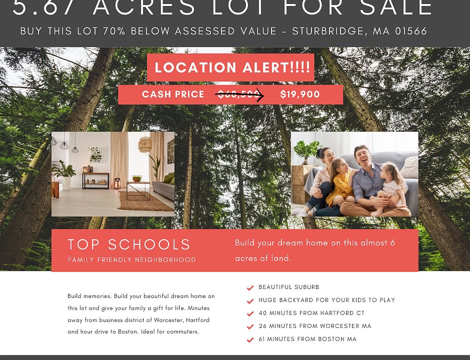 LOCATION ALERT!!! - 5.67 Acres Buildable Lot - 70% BELOW ASSESSED VALUE ----------------------------------------------------------------------- PROPERTY SUMMARY ---------------- 5.67 acres buildable lot in Sturbridge, MA. Build your dream home, or secure this property today for your future plans. This is ideal location for people working in Worcester MA, Hartford CT or Boston MA. You know its all about LOCATION. Great schools. We offer this property 70% below assessed value for the cash price of only $19,900. PROPERTY VALUE -------------- This property is assessed for $68,500 and is offered for sale only for $19,900 which means you save over $48,000 from assessed value. PROPERTY DETAILS ---------------- Size: 5.67 Acres Dimensions: 380 x 512 x 422 x 460 Topography: Level Property Reference Number: 6005 APN: Stur-000455-000000-000645-000319 GPS: 42.1563, -72.0752 Address: 319 New Boston Rd, Sturbridge, MA 01566 Google Maps: https://goo.gl/maps/ZKM9mfkL3ojH2KQu9 PROPERTY USE ------------ Zoning: RESIDENTIAL Time limit to build? No – it can stay vacant as long as you want Mobile home allowed? Unknown UTILITIES --------- This property is surround by homes so power and water is available. However, buyer is required to perform their own due diligence regarding the availability and cost of all utilities required for their needs. PURCHASE OPTIONS ---------------- We offer this property only for cash price of $19,900. READY TO BUY? ------------- We make the purchase process simple and easy. Just message us here to get started. This is an assignment of contract. ------------------------------------------------------------ *************************DISCLAIMER************************* ------------------------------------------------------------ Buyer is responsible for verifying all information with the County as to what can and can't be done with the property. Buyer will need to work with the County to obtain the proper permits if needed. Buyer will also need to confirm the availability of any utilities needed or serviced on the property. Seller makes no warranties or representations about the land, its condition, or what can be built on the property.