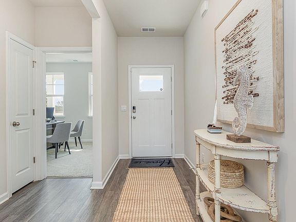 This thoughtfully designed one level home is one of our most popular floor plans! With an open concept living room, dining room and kitchen, this home is bright, spacious, and designed for entertaining guest or comfortably interacting with family. The kitchen features granite countertops, 36" cabinets, a spacious pantry, stainless steel appliances including a refrigerator, and island with breakfast bar! Your primary suite awaits off the back of the home with a spacious walk-in closet and master bath with double sinks, a linen closet and 5' shower. Two secondary bedrooms are at the front of the home providing separation from the primary suite. Enjoy the coastal air from the back porch as you wind down in the evening! 2 car garage with garage door opener. This is America's Smart Home! Each of our homes comes with an industry leading smart home technology package that will allow you to control the thermostat, front door light and lock, and video doorbell from your smartphone. *Photos are of a similar Aria home. Pictures, photographs, colors, features, and sizes are for illustration purposes only and will vary from the homes as built. Home and community information, including pricing, included features, terms, availability and amenities, are subject to change and prior sale at any time without notice or obligation. Square footage dimensions are approximate. Equal housing opportunity builder.