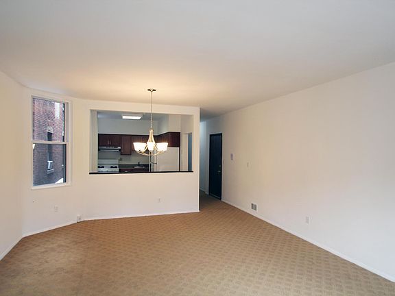 This recently renovated two bedroom apartment is very good. Giant living room with big windows and much natural light. An elegant decorative hanging lamp is situated above the dining area. Full kitchen with beautiful cherry stained wood cabinets. Two bedrooms with big closets. Apartment is fully carpeted. Dogs and cats are permitted. A/C. Tenant pays for gas and electric. Non-smoking.