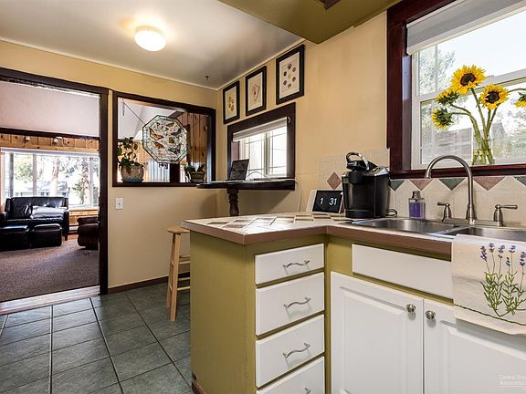 Sought after location in the heart of Bend. Wonderful mountain and Old Mill stacks view when you walk out the front door. This single story delightful home has great a 1940's vibe and is very well kept by the owners. The property has a iconic West Side storage shed/garage on the back side of the home. Three bedrooms, one bathroom with vaulted ceilings. Almost every surface of the home has been updated since its original 1945 build date. Quaint covered front porch. Peaceful fully fenced backyard to relax while on the sitting porch watching your children or pooch enjoying the grassy yard, mature plants and trees. If you wish to be walking distance to the Old Mill District, just a bit further to Downtown Bend, with great South-West Bend charm, this is the home for you. The home currently holds a Type I Short Term Rental Permit. Listen to summer concerts from the comfort of your own yard.