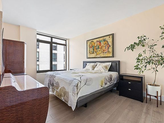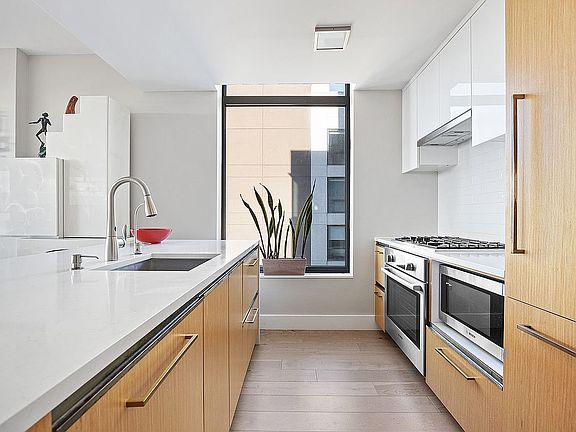 A few details make 12B one of the most desirable lines in the building. For starters, a lovely entryway creates a moment to relax before entering the apartment. Take off your coat, take off your shoes and unwind before entering into your quiet oasis in the sky. As you continue on, you will immediately be ‘wowed’ by this corner, sun-filled living room. With views of brownstone Brooklyn and the Verrazano Bridge, this first impression is truly jaw dropping. Flooded with southern light, this quiet and serene apartment is high above it all with floor-to-ceiling windows, gorgeous 6 inch white oak wood floors, integrated central air conditioning, fully outfitted closets and custom motorized shades in every room.