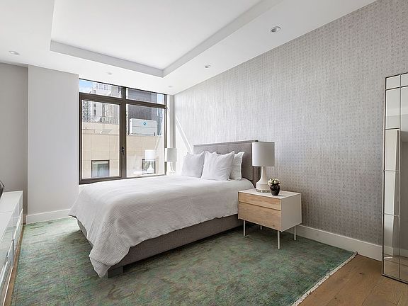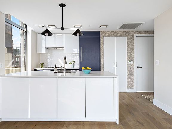 A formal entrance gallery leads to the open living/dining room with floor-to-ceiling windows overlooking Boerum Hill to the south and Downtown Brooklyn to the west. The windowed chef’s kitchen features a suite of Bosch appliances (stove, oven, microwave, refrigerator, and dishwasher), navy and white lacquer cabinetry, Caesarstone frosty carrina quartz countertops, a pantry, and a breakfast bar with custom storage.