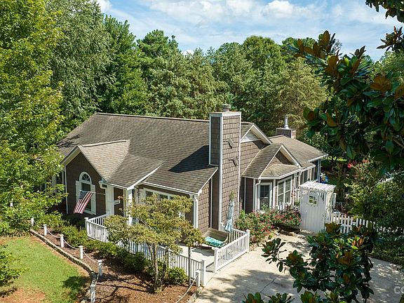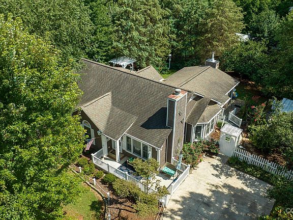 This gorgeous home looks like it should be in the Hamptons with the Cedar shake (vinyl) siding and beautiful landscape with many ornamental trees and fruit trees. Its hard to decide where is the place to enjoy the outside with a covered patio, covered swing area and pergola sitting area in addition to sitting area in front of home. Inside is charming and welcoming. Features include 2 fireplaces- a woodstove and gas logs, beautiful light fixtures, vinyl plank flooring throughout most of home, plank ceilings and much more! This property also has 3 wired workshops/storage buildings.