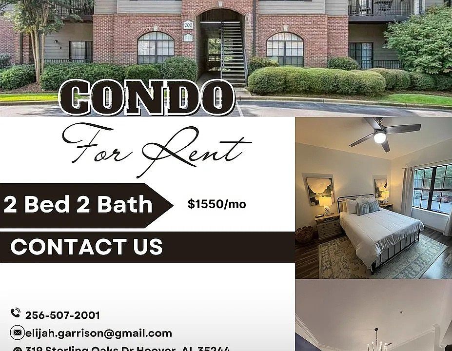 LOCATION, LOCATION, LOCATION. Excellent, convenient condo in Riverchase, zoned for Hoover schools, perfectly tucked away from the noise, yet minutes away from Hwy 31 & I-65! This 2 bed/2 bath condo is a NEWLY RENOVATED unit with a vaulted ceiling, bathed with natural light, and a well-proportioned, open floor plan. All stainless steel appliances, updated bathrooms, fresh paint, and light fixtures, a dry bar, and no carpet make this unit MOVE-IN READY! Both bedrooms have excellent closet space. Spending time in the great room allows you to enjoy the gas fireplace in the wintertime. Off the great room features a private, covered back deck, perfect for winding down. Welcome home to 319 Sterling Oaks! -Annual Lease term -Tenant will pay rent + utilities -NO smoking -Security deposit will be due at time of rental agreement. -Pets ARE allowed with a Pet fee -Shared parking area -Shared community gas grills -Vallet Trash Pickup