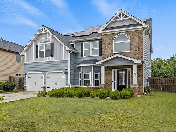 Welcome to 319 Turkey Run! Conveniently located in Three Bridges this quiet community offers a Greenville address in a Powdersville School district. You're just 12 minutes to downtown Greenville. This 5 bedroom 3 full bath energy efficient home is turnkey and ready for the next owner. As you step into the grand foyer note the high ceilings, fresh paint, updated floors, and details like the arched entryway to the dining room and sitting area. The kitchen is well equipped with granite tops, a gas cooktop, and large fridge. The kitchen flows nicely to the breakfast nook, and living room featuring a gas fire place. Down stairs you'll find a full bath next to the bedroom and a walk-in laundry room off of the large 2 car garage. Head up the stairs also with new flooring to see the additional 4 well-sized bedrooms and 2 baths. Each room has tall ceilings with plenty of natural light. Down the hall you'll find the extra large primary suite featuring it's own office and a large walk-in closet. The ensuite bathroom makes your morning routine easy with 2 separate vanities, a large soaking tub, and separate shower. Sit outside in the fresh air under your covered porch or stay in and enjoy super low energy bills courtesy of the owned solar panel system which conveys with the home. Other energy efficient features include a tankless hot water heater, and recently replaced AC condenser. Preferred lender programs are available. Schedule your showing today!