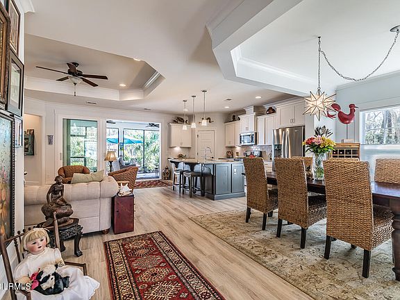 Simply Enchanting! Great open floor plan for entertaining and living on one level plus large Bonus Room/Bedroom and bath upstairs. Truly move-in ready with custom Art glass in front door and side panels and Master bedroom door to spacious screen porch. Hunter-Douglas shades on all windows and beautiful built-ins surrounding the gas fireplace. Bubbling salt water spa is surrounded with plants in a backyard oasis. All landscape/hardscape professionally installed with paver front porch, screened porch, patio and two curved lattice bricked walls with garden uplighting. Abundant storage in over-sized garage with utility room and epoxy sealed floor. Come and Live the Dataw Island Lifestyle in this Exceptional Home!