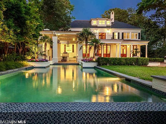 STATELY GEORGIAN REVIVAL MANSION ON MOBILE BAY! This Impressive Residence Has Classic Historical Elements That Take You Back In Time. Designed By Mac Walcott & Recently Completely Renovated By The Original Builders, Randy and Eric Crocker! Massive Two-story Columns, Flickering Gas Lanterns, Mahogany Front Doors, Wrought-iron Enclosed Balconies, & Antique Shutters Grace The Painted Brick Façade. As You Step Into The Two-story Entry Hall, A Sweeping Staircase Wraps Around An Antique Crystal & Bronze, French Chandelier. Reclaimed Heart Pine Floors, Found Throughout The First Floor, Gleam In The Sunlight. Flanking the Foyer Is A Formal Dining Room & Wet Bar That Leads To The Breakfast Area & Chef's Kitchen. Filled With Natural Light, The Kitchen Is Equipped With A Viking Gas Range & Griddle, Sub-zero Refrigerator, Bosch Dishwasher, New Custom Inset Cabinets With Honed Marble Counters, Marble Subway Tile Backsplash, Farmhouse & Prep Sink, Pot Filler & Kitchen Island! Don't Miss The Elevator, Butler's Pantry , Large Laundry, Half Bath & Desk Area Near The Back Stairs. The Master Suite Overlooks The Bay & Has A Luxurious En Suite Bath, & Two Spacious Closets. The Great Room Features A Fireplace With Built-ins, Painted Plank Board Ceilings, & Mahogany French Doors Opening To The Covered Porch. The Porch Has Beautiful Slate Floors, An Outdoor Kitchen & Overlooks A Saltwater Pool, Hot Tub, Covered Patio w/Fireplace, Half Bath, Icemaker, Outdoor Refrigerators, And Breathtaking View Of The Bay, Brand-new Pier & Boathouse. The 2ndStory Has 3 Bedrooms, 3 Full Baths, 2 Half Baths, Study w/ Balcony Overlooking The Bay, Media Room, & Lounge. On The 3rdFloor, A Huge Exercise Room, 5thBedroom W/Full Bath, New HVAC & Oversized Attic Storage. A Covered Walkway Leads To A Heated & Cooled Triple Garage w/ Workshop Area. Established Trees & Landscaping Surround The Home. Additionally, The Home Is Equipped w/ CentraLite Home Automation System, A Custom Audio System & Whole House Generator.