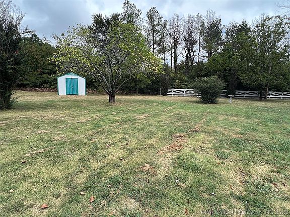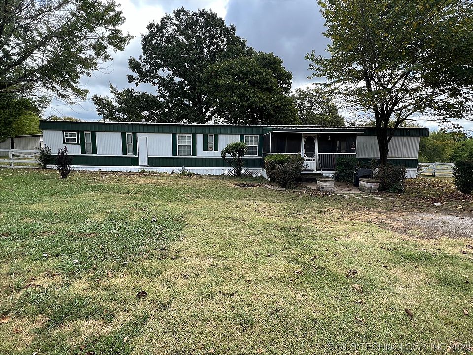 1979 mobile home sits on very well-maintained five acres, with stocked pond, mature trees, rolling hills, loafing shed, and mostly fenced. Just a few miles from the turnpike, right outside the town of Muskogee. Mobile had a metal roof put on around 10 years ago, and a covered, screened-in porch attached.