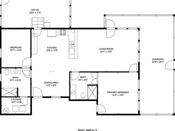 - All Bedrooms Down, Two Primaries, Split Bedroom Plan, Renovated Bathroom, Living Room, Dining Room, Kitchen, Primary Bedroom, 2nd Bedroom, 2 or More Baths, Laundry Room, Sun Room, Office, Storage