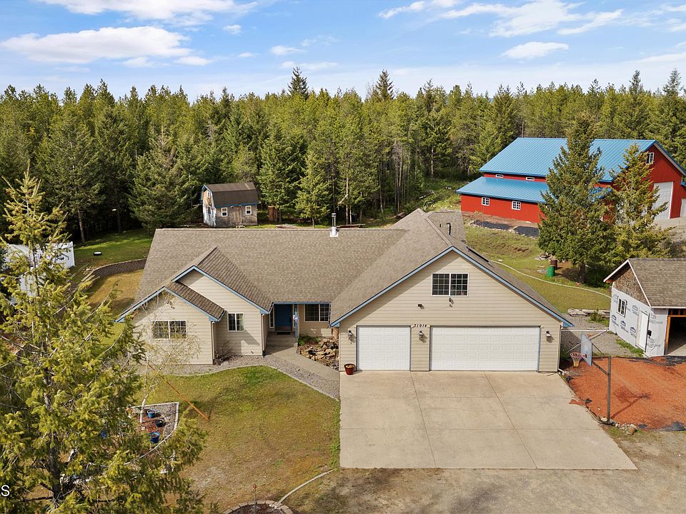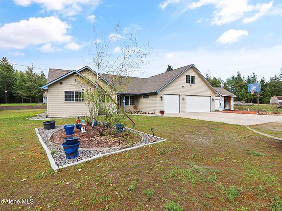 Looking to reside in absolute privacy on 10 acres with a HUGE shop just minutes from town? Then you have found the right place!! This well-designed 4-bedroom 3-bath home has vaulted ceilings, a wood burning fireplace, and a large 3-car garage. The master suite is conveniently located on the main floor along with a large kitchen, dining room, living area, 2 bedrooms, guest bath, laundry room, and an additional office space. Upstairs is a large bonus room, bedroom, and bathroom. The expansive outdoor yard area features an enclosed garden, 2 outdoor storage buildings, and a deluxe clothesline. The massive 64'x60' shop (built in 2018) has 4' wide stairs leading to an upstairs loft that is 17'x60' with 8' high ceilings. This mostly level property is heavily timbered with beautiful mature evergreen trees making it the perfect canvas! Just 8 minutes from Spirit Lake and 15 minutes to Athol. Seller is offering $10,000 in buyer concession! Come see for yourself - the possibilities are endless!