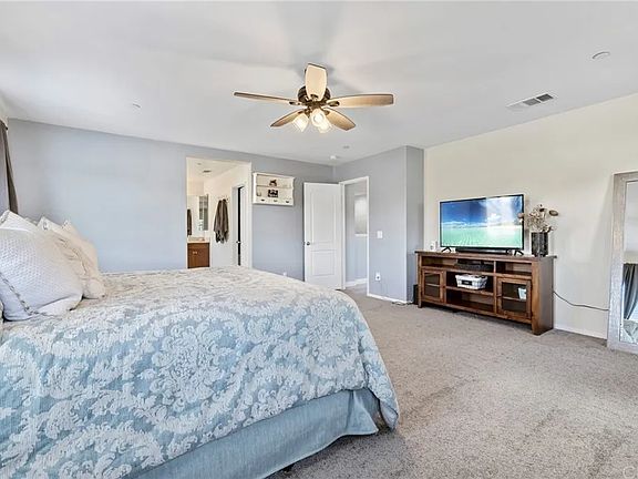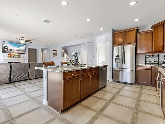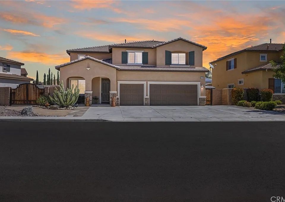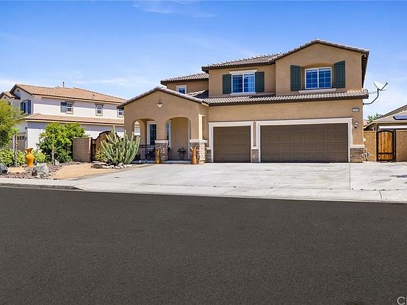 Welcome home to this stunning 5-bedroom, 4-bathroom residence with a loft and RV parking, nestled in the heart of Menifee with no HOA. For Rent. The property boasts an extra-wide driveway, accommodating multiple vehicles, and grand custom wood gates opening to RV parking. Drought-tolerant landscaping with river rock, decorative gravel, and stamped concrete leads to a welcoming porch with breathtaking mountain views. Inside, you'll discover soaring ceilings, recessed lighting, tall white baseboards, custom paint, and elegant 18"x18" designer tile throughout the first floor. The main level features a formal living and dining area, ideal for use as a flex space, office, or additional entertainment area. A spacious family room, bathed in natural light from abundant windows, showcases a gas fireplace with cutouts perfect for built-in bookshelves. The gourmet kitchen features granite countertops, an eat-in bar, stainless steel appliances, a walk-in pantry, and ample cabinetry. A main-floor bedroom with a full bath adds convenience. The second story boasts LVP flooring throughout the main areas and plush carpeting in the bedrooms. tenants are responsible for pay all Utilities SDGE, Water And Trash
