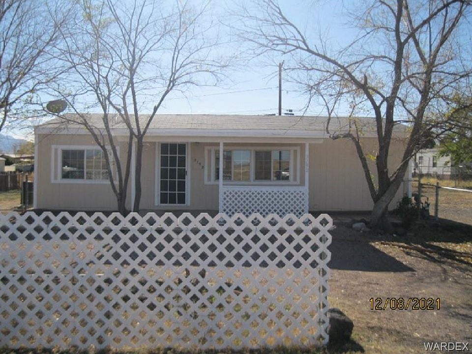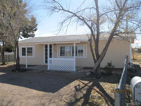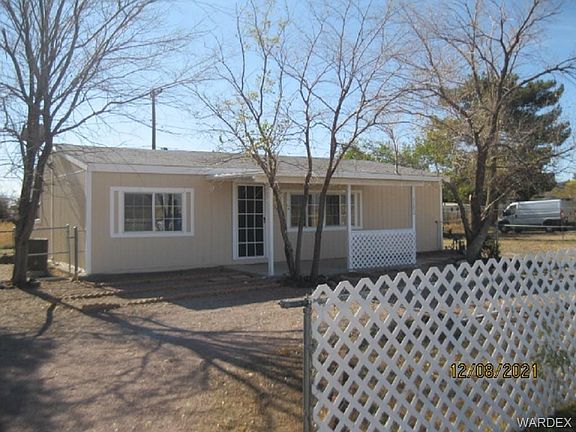 Three bedrooms, two full baths with new wood flooring and new paint in living room, bedrooms and kitchen. 1999 Champion home with new paint outside and two covered patios. Large double lot has drive thru gate and RV parking. Two sheds to store you tools or extra "stuff". Chain link fenced and pull through drive in the front. This home is clean and move in ready. From front patio you can enjoy the scenery of the nearby mountains, as well as the Hualapai Mts from back patio.