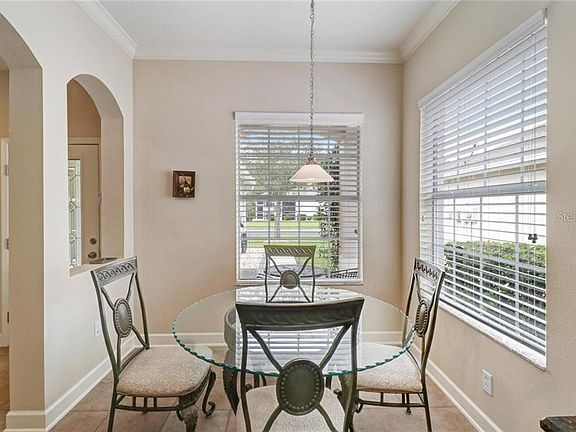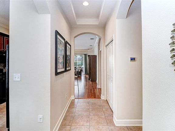 Meadow Pointe III - Maintenance Free. The gated enclave of Larkenheath has private tree-lined streets and nature views. This villa has 2 bedrooms, an office, 2 baths, and a 2 car garage. Upon entering the home, you will notice the architectural details, tray ceilings and crown molding. The natural light, hardwood flooring, and open floor-plan set the tone. The kitchen has granite counters, upgraded cabinets, gas range, and a Bosch dishwasher. Seating options include the breakfast bar and the dinette. The kitchen overlooks the great room, office, and covered patio. The patio has been extended and screened. The master bedroom has wood floors, crown molding, a window seat, and a large walk-in closet with custom shelving. The master bath has a garden tub, separate shower, and dual vanities. The second bedroom has laminate flooring, privacy and easy access to the second full bathroom. The air conditioning, dishwasher, washer and dryer were replaced over the last couple years. Meadow Point III residents enjoy a community clubhouse with a pool, fitness center, tennis courts, and a playground. The neighborhood is conveniently located near The Shops at Wiregrass, Advent Hospital, Pasco-Hernando State College, Center Ice, Tampa Premium Outlets, I-75 & I-275. Property tax includes the CDD.