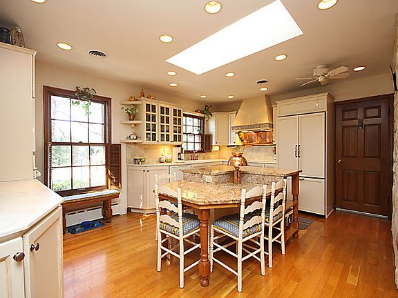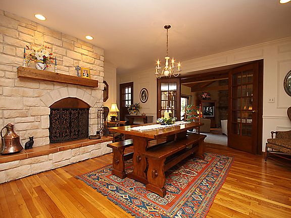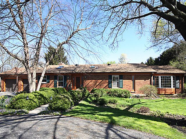 Beautiful and private nature-filled retreat surrounded by trees, close to town and shopping.Spacious quality built brick ranch:4 beds including master suite with sitting area & 3.5 baths. Newer Gourmet kit with large granite island and built-in appls w/ natural stone firepl in open DR. Sun-filled FR with 2 story firepl, finished basement, 2.5 car heated garage. Huge paver deck with towering flower-filled gazebo