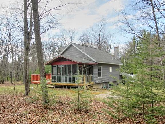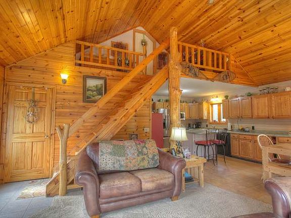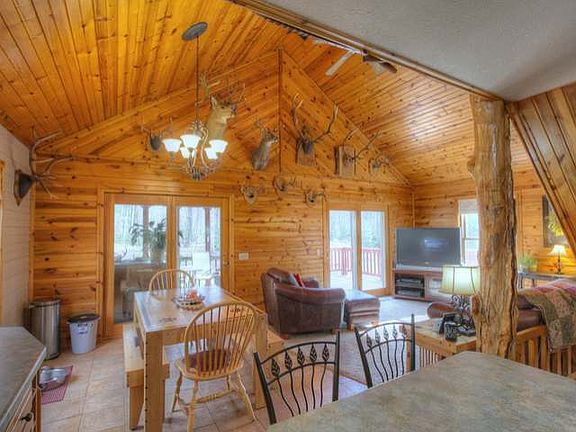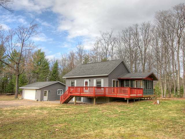 NORTHWOODS CHALET - situated on 4 acres East of Eagle River with easy access to the Nicolet Forest as well as town conveniences. There's an oversized two-car garage, home with spacious wrap-around deck and a beloved screened porch to sit back and relax in the peaceful surroundings. The main level includes an open-concept living area with vaulted ceiling, knotty pine walls and ceilings, tiled kitchen and dining areas, a full bathroom and main level bedroom with closet. Upstairs in the loft there's a seating area and private bedroom. Three quarters of the space downstairs is finished with large windows in the family room, a bonus room, and a utility room with a laundry area and roughed in plumbing for a future bathroom. It's a value-packed residence or vacation getaway up north!