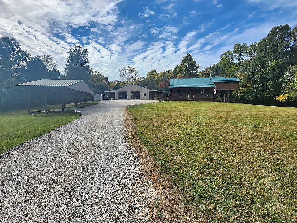 Patoka Lake Living at the finest location adjoining the DNR Fall color Forrest. Marina is minutes away to walk on your boat at the dock. This Home comes with a nice size above ground pool and large garage not found with any other cabin in the area !!! From a Comfy and Cozy hearth room, the warmth of a wood burning fireplace and new kitchen, the stone fireplace is visible from the eat-in kitchen and the two living rooms. Relax and enjoy this property both inside and outside !! Outside !!! are vast spaces for watching sunsets from open sky decks, patios and in the pool. In the winter watch the sunsets from the warm sunroom. Enjoy morning conversation on the east porch. Silence can be golden listening to the forest wildlife awaken. This is truly the unique property you have not seen before. Come as soon as you can for this Patoka Dream Home ! You have everything imaginable here. New eat in kitchen with Corian counters. 2 New spacious baths. Most efficient ducted HVAC plus a new mini split system to zone temperature comfort for you and your guests. The 3 bay garage is 36 x 24. It has 4 overhead doors and a hobby bench. More to enjoy is the above ground pool...The All Season porch for large gatherings plus the full length covered front deck. 2 new nice size baths, Large bedrooms on both levels. and the large 2nd living room on the upper level. The upper living room is adjacent to the primary bedroom bath suite. Main level has large dorm type bdrm with 2 full size beds. Full size washer/ dryer closet. Newer kitchen appliances included as well as most of the fine furnishings thru out this home. This is your ONCE IN A LIFE TIME opportunity for all this property has to offer. DNR property access, nice pool, both sun and shade areas on this property plus a large garage and efficient utilities. What more could you ask for at this price ??? Vast outdoor living spaces. Just one of the nicest features is the beautifully furnished sun room with views of the trees and windows that open for that fresh air you do not get anywhere else. Patoka Lake offers fresh air and comforting daylight everyday in Southern Indiana! This is adjoining 100's acres undeveloped government property. All this and more... This home comes furnished with all you will need to live and vacation. This can truly be a large group gathering home and a cozy place for just you and a few.